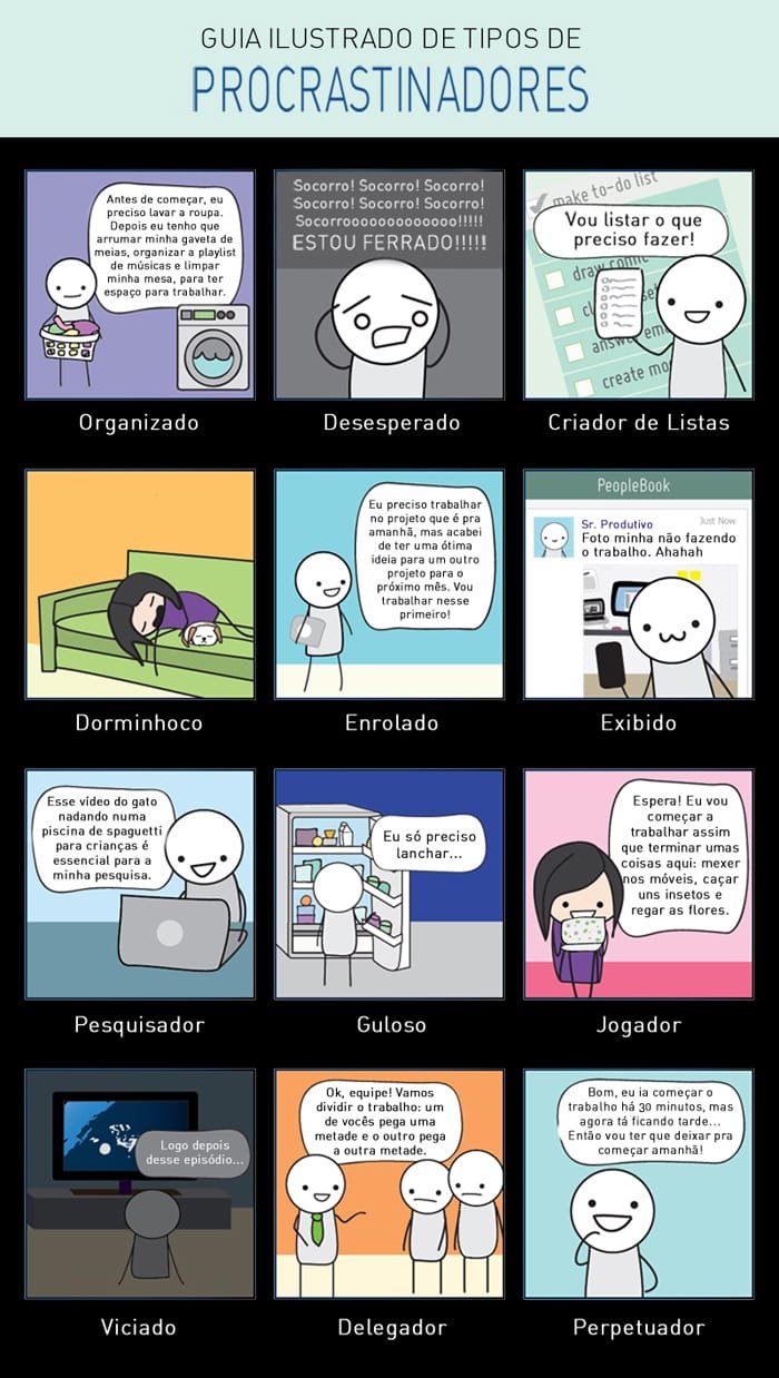 Foi assim que encontrei um blog, onde a colunista resolveu ilustrar os diversos tipos de procrastinadores existentes – isso depois de também procrastinar a atividade por algum tempo. O resultado vocês veem abaixo. Eu me identifiquei com muitas situações, e vocês? Encontraram alguma semelhança com seus hábitos? Acham que a procrastinação ajuda ou atrapalha no desenvolvimento de seus projetos?