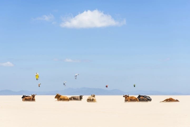 “Cows And Kites”, por Andrew Lever. Búfalos em uma praia vazia com calor de 35º.