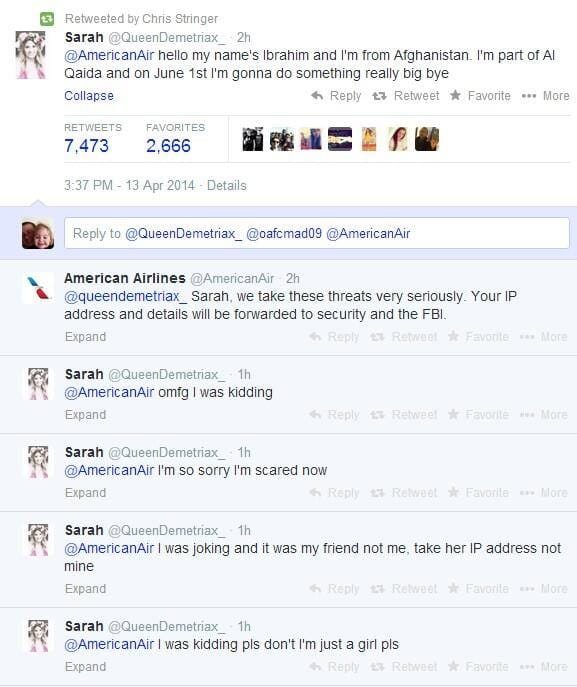 e mais recente, a “ameaça” de uma adolescente holandesa de 14 anos à American Airlines. Na brincadeira, a holandesa fingia ser membro da Al-Qaeda do Afeganistão e terminou sendo presa.