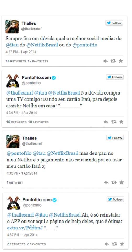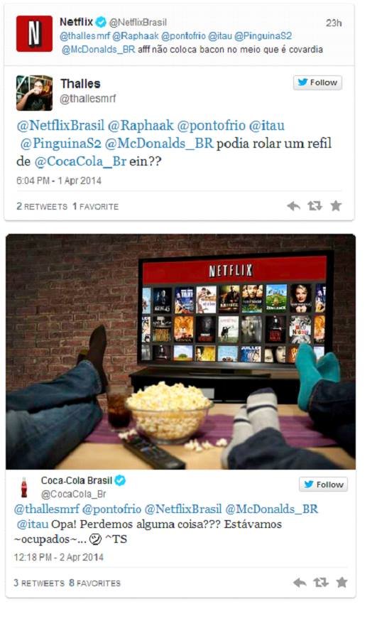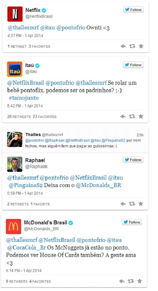 Mas, há casos que mostram uma grande interação entre marcas e público, como aconteceu no Twitter iniciada a partir do comentário de um usuário envolvendo empresas como Netflix, Ponto Frio, Itaú, Mc Donalds e Coca-Cola.