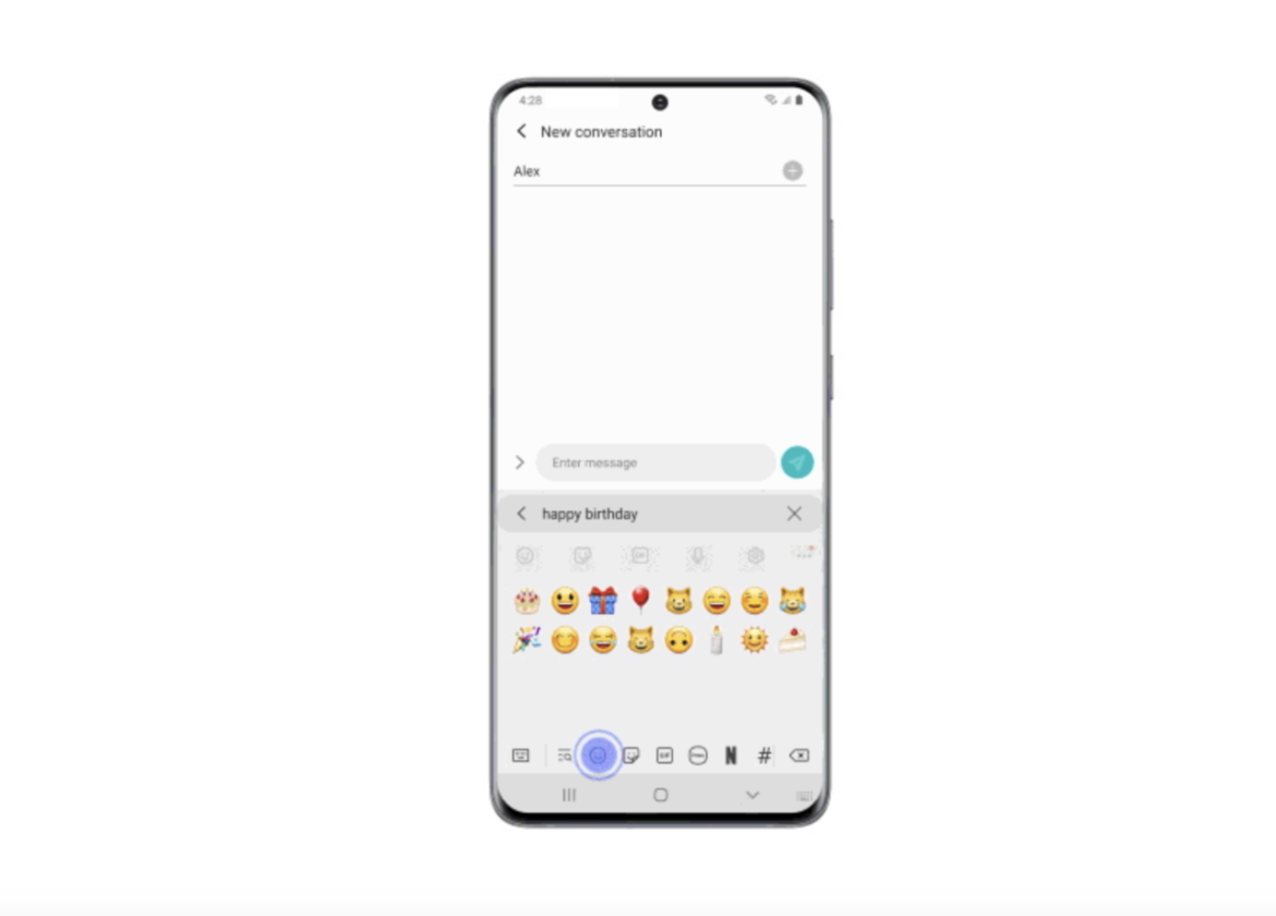 O teclado do S20 também permite procurar GIFs e stickers. Tudo o que você precisa fazer é digitar uma palavra-chave na barra de pesquisa e ela exibirá imagens que podem dar vida às suas histórias. Toque no ícone “Expandir Barra de Ferramentas”, clique em “Pesquisar” e digite suas palavras-chave. O recurso exibirá diferentes categorias de resultados de pesquisa.