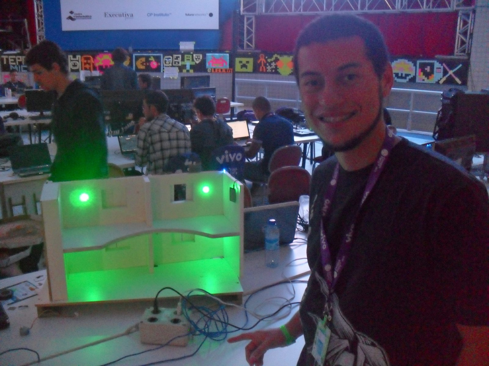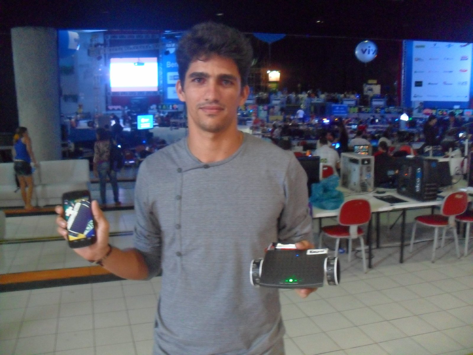 Encontramos também o desenvolvedor de sistema de Natal/RN Alex Aquino que trouxe à Campus um protótipo de cão guia feito com material de sucata. Guiado por um smartphone, o cãozinho se move graças a um software desenvolvido por Alex. ”