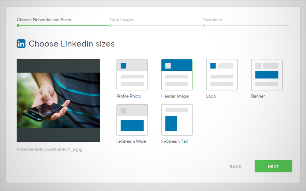 3. O passo seguinte é a escolha para qual rede social a imagem vai, então clique no ícone referente a rede e depois em “next”. Para este exemplo eu escolhi o Linkedin.