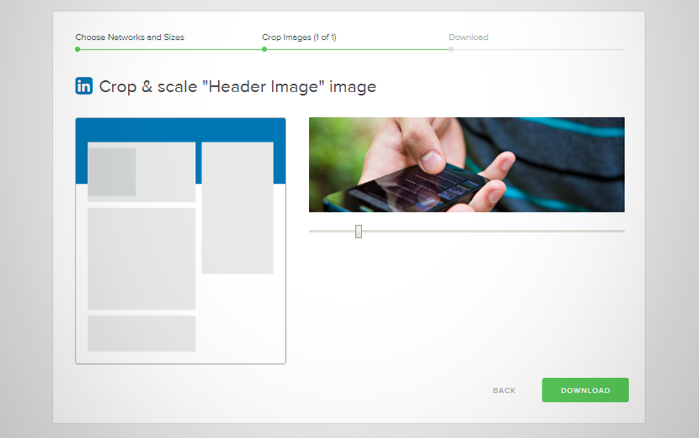 4. E quando você acha que acabou, o site te dá a opção de escolher o formato de uso para a imagem selecionada dentro da rede social. Eu selecionei que minha imagem será recortada para a capa do meu Linkedin.