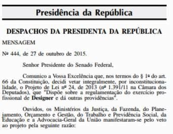 A Presidenta Dilma Rousseff vetou a regulamentação da profissão de Designer e segundo a nota foram ouvidos Ministérios da Justiça, da Fazenda, do Planejamento, Orçamento e Gestão, do Trabalho e Previdência Social, da Educação e a Advocacia-Geral da União e todos manifestaram-se pelo veto porque a “Constituição, em seu art. 5o, inciso XIII, assegura o livre exercício de qualquer trabalho, ofício ou profissão, cabendo a imposição de restrições apenas quando houver a possibilidade de ocorrer dano à sociedade.”