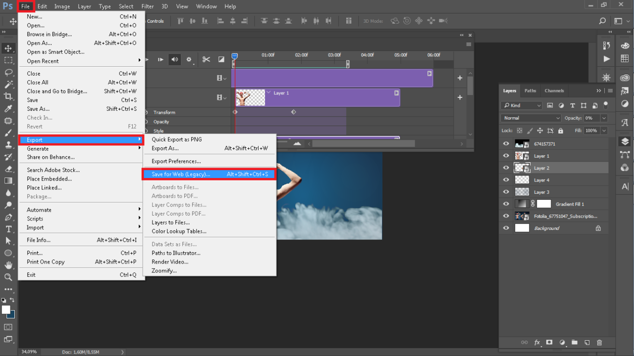 – Clique com o botão na opção Arquivo/File e depois Save for Web/Salvar pra Web;