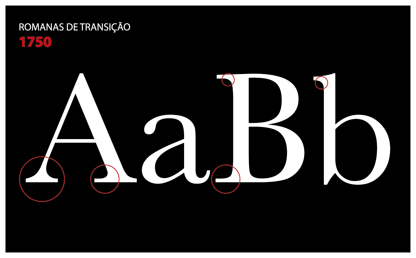–Transição – 1750 – Este estilo é uma refinação evoluida das Romanas antigas, e foram possíveis devido à possibilidade de fundir tipos. São letras serifadas sempre que existam hastes, tanto na versão de caixa-alta como em caixa-baixa. A sua principal característica é na junção da haste com a serifa fazer um angulo arredondado. A diferença de espessura entre hastes também é pouco acentuada.