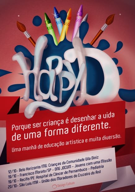 Desenho, pintura, diversão e muita alegria é o que promete o Happy D! evento organizado pelo Blog Design Culture, que neste ano de 2013 em sua primeira edição, passará pelos estados de SP, PE, MG e MA no mês de Outubro (mês das crianças).