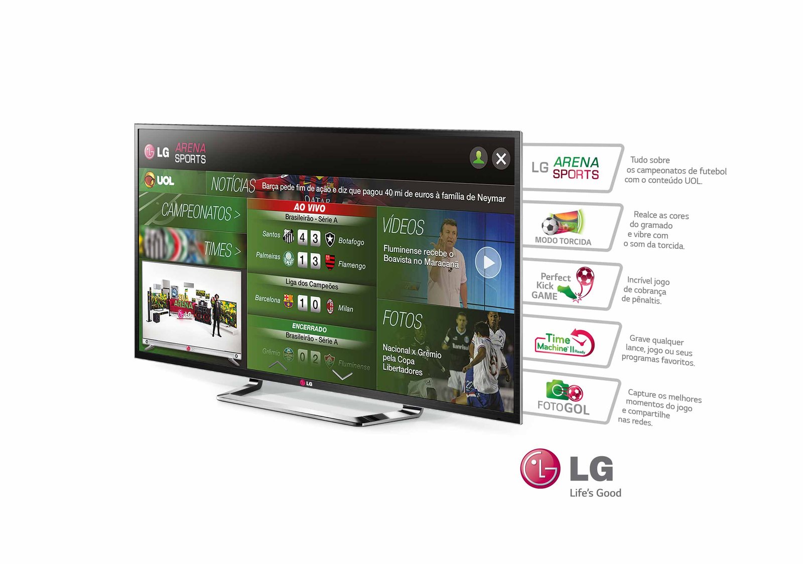 Para iniciar a experiência, a empresa apresenta, com exclusividade, o aplicativo LG Arena Sports,que contém tudo sobre os campeonatos brasileiros de futebol e as principais ligas mundiais, com conteúdo UOL. Nele é possível verificar a classificação dos times, os resultados ao vivo dos jogos e as notícias mais relevantes ligadas ao mundo do esporte. Ainda é possível assistir aos vídeos e fotos mais importantes das rodadas, permitindo rever uma conquista histórica ou a expressão do jogador durante um gol. Tudo isso com apenas um click no controle remoto Smart Magic, que permite navegar na TV como um mouse, além de permitir fazer buscas e post com voz.