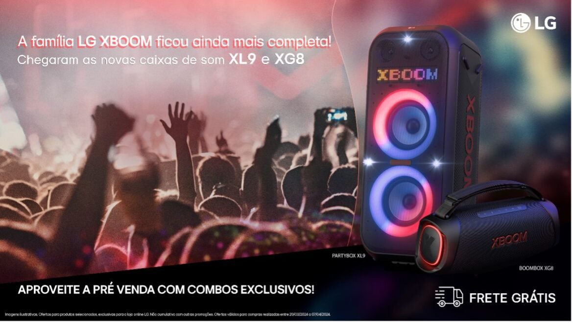 A LG Electronics lançou uma ação especial de pré-venda com descontos expeciais para as novas caixas de som LG XBOOM Go XG8 e LG XBOOM PartyBox XL9. No período da ação, válida no site oficial da marca até 07/04/2024, o cliente poderá adquirir as novidades com combos exclusivos, além de garantir Frete Grátis para todo o Brasil¹.