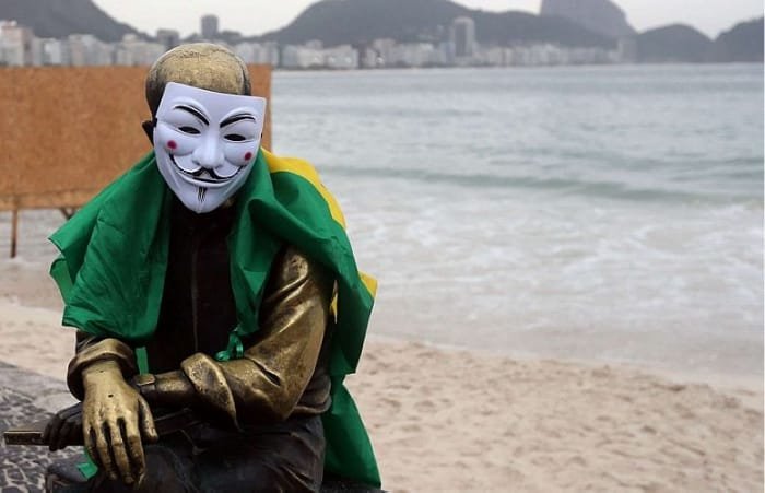 Nas duas fotos, temos um sujeitinho muito especial que marcou bastante as manifestações da Copa das Confederações. Muitos o chamam de Anônimo, o sujeito de máscara branca com bigode preto. Se é anônimo talvez a gente não devesse perguntar quem é ele, mas…