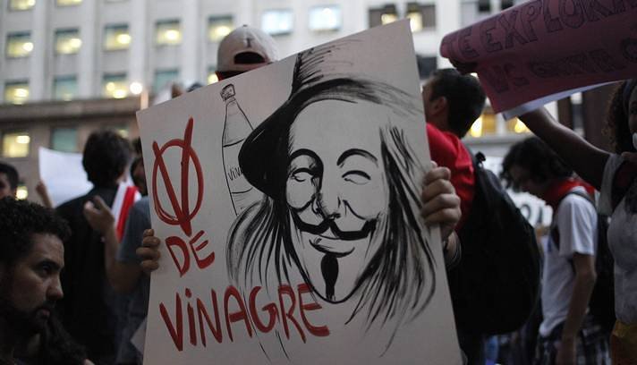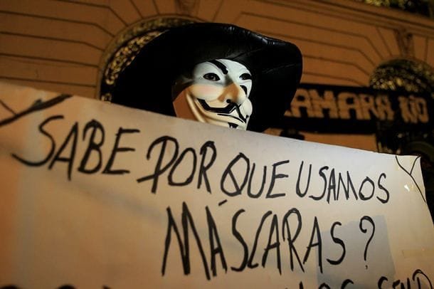 E, a partir daí, vemos essa cara em vários protestos anticapitalistas pelo mundo todo. Até mesmo Julian Assange, o fundador do WikiLeaks, já apareceu com uma dessas. A utilização delas seja como uma forma de anonimato impensada, seja como uma representação de luta anárquica contra o poder dominante é simplesmente pura ironia. Uma manufatura da indústria cultural cinematográfica americana virou ícone da luta anticapitalista.