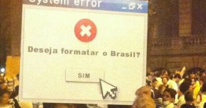 Essas duas mulheres carregam os mesmos dizeres mas de forma muito distintas. A primeira, fez seu cartaz de próprio punho, manuscrito, pessoal. É a letra dela que está ali. A segunda, porta um cartaz feito digitalmente, com projeto gráfico fazendo referência a sinalização de obras. Ela replica um dizer. Ela o suporta e massifica. Qual das duas você considera mais genuína? Qual das duas está mais institucionalizada dentro de um discurso? Qual é o melhor cartaz?