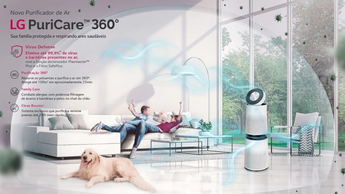 A LG lança no mercado nacional o PuriCare™ 360°, um purificador de ar com uma tecnologia que promete absorver e eliminar até 99,9% dos vírus, bactérias, alérgenos, partículas de poeiras, poeiras ultrafinas, pelos, odores, fumaças e gases prejudiciais à saúde.