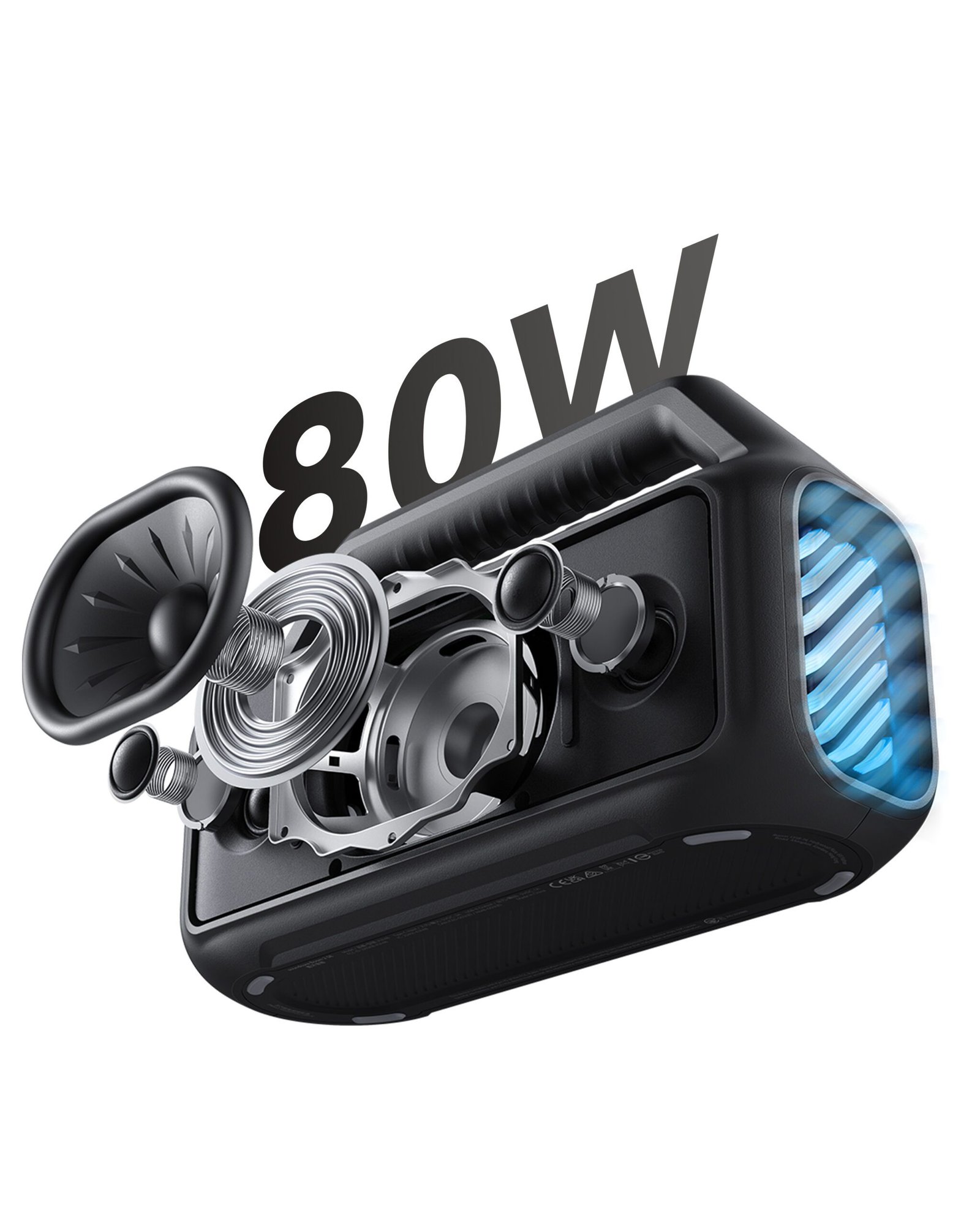 Graves que Você Sente, Não Só Escuta A tecnologia BassUp 2.0 da soundcore funciona como um “turbo” para os graves: quando ativada, ela potencializa o subwoofer de 50W para entregar até 80W de potência máxima, criando aquela pressão que você sente no peito durante funk, eletrônica, sertanejo e muito mais.