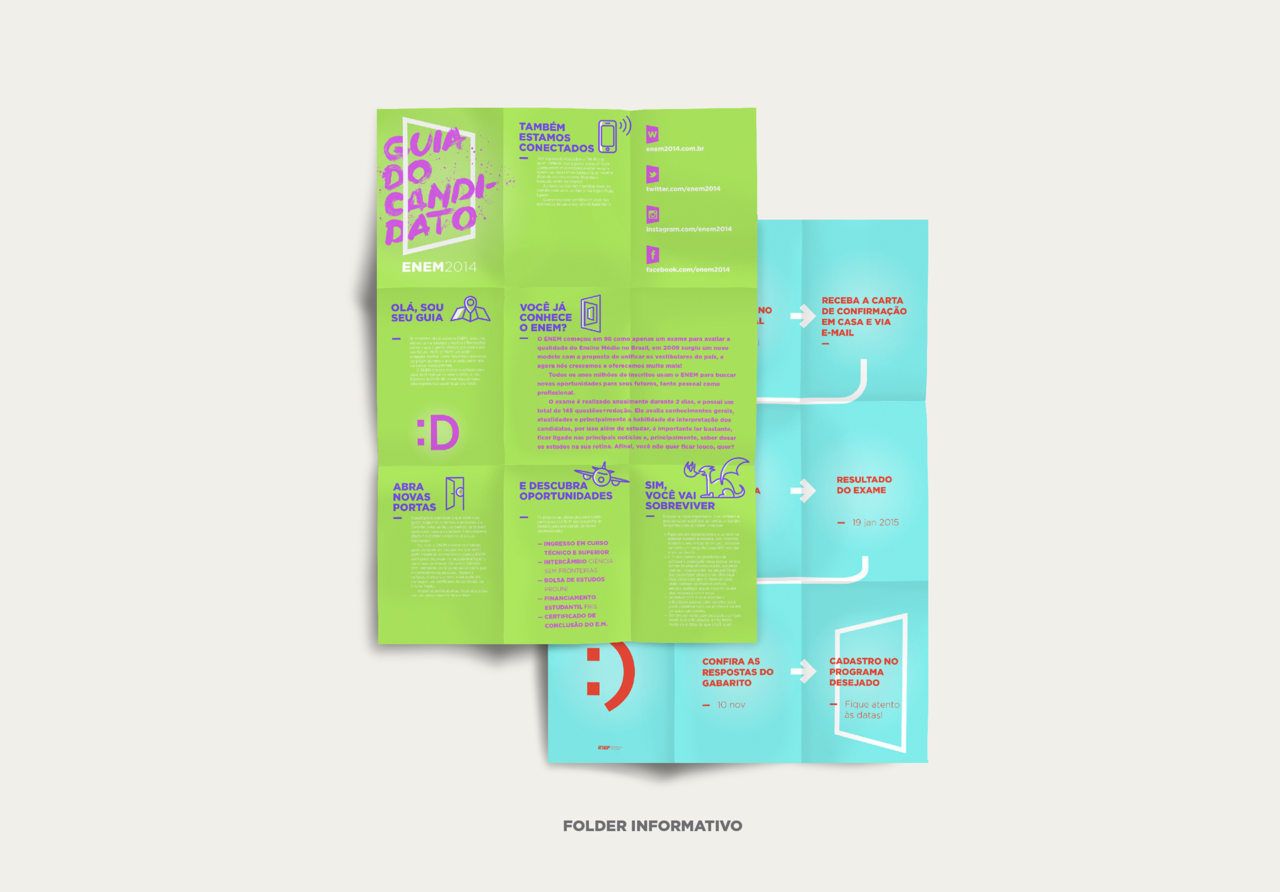 Uma das maiores dificuldades dos participantes é encontrar informações sobre o processo, principalmente por meios oficiais, onde há garantia de que a informação é 100% verdadeira. Por isso, foi desenvolvido um folder voltado para este público, com todas as informações básicas mais detalhadas. Esse material seria distribuído em escolas de todo Brasil, tendo como foco novos alunos do Ensino Médio, que ainda não conhecem ou realizaram o exame.